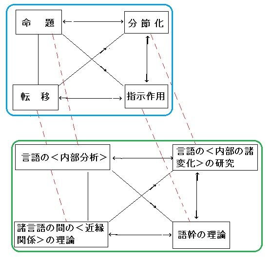 語根の分析から導かれる諸言語の間の<近隣関係の諸体系>についての新しい規定(表象的言語観にみられる連続性を断ち切ることで、語幹の変様、屈折体系、屈折語尾系列の研究によって言語と言語を直接比較できるようになった。)