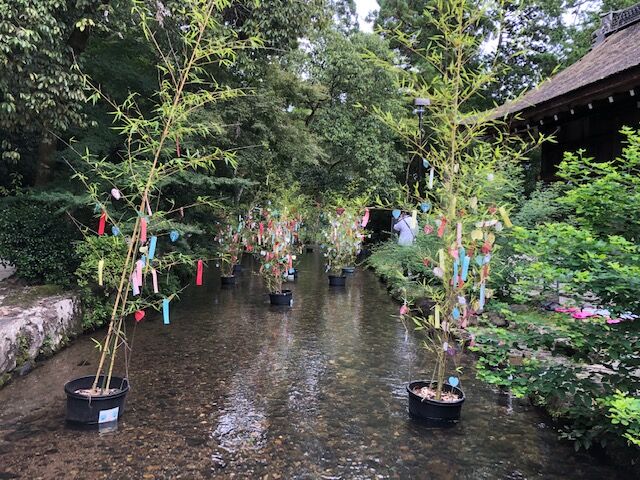 これは昨日撮った写真ですが、境内に近い、「土屋」の横から、「ならの小川」には、七夕飾りをぶら下げた竹が、鉢に入れられて水の中にいくつも立っています。水際に幾足ものゴム草履がおいてあったので、水の中に入って七夕飾りを見てください、ということかもしれません。