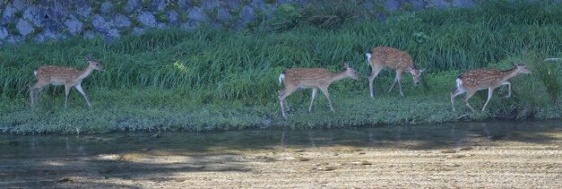 高野川の鹿、今日姿を見せたのは一頭だけ。今年開通した左京区役所のほうへいく新しい橋の下で川の水の中にたたずんで涼んでいました。そのうち、今は日照りで浅くなった川の中をひとりこちらのほうへ歩いてきて下流方向へ行きました。野生の鹿の体はやっぱりこうしてみると美しいですね。