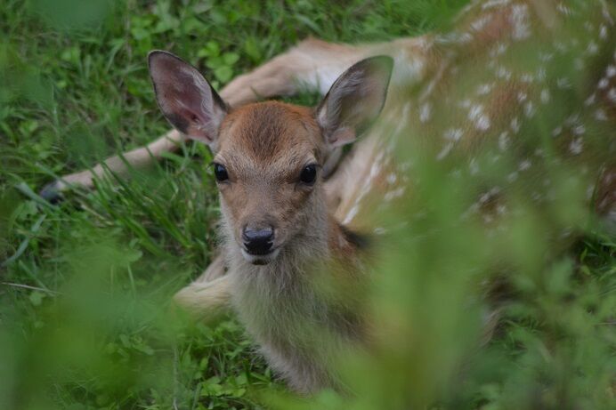 暑さで疲れてしまうのか、仔鹿同士遊ぶこともなく、それぞれ草の褥に横たわって休憩。周囲を少し丈の高い草で囲まれて涼しく居心地よさそうな場所を上手にみつけてきます。